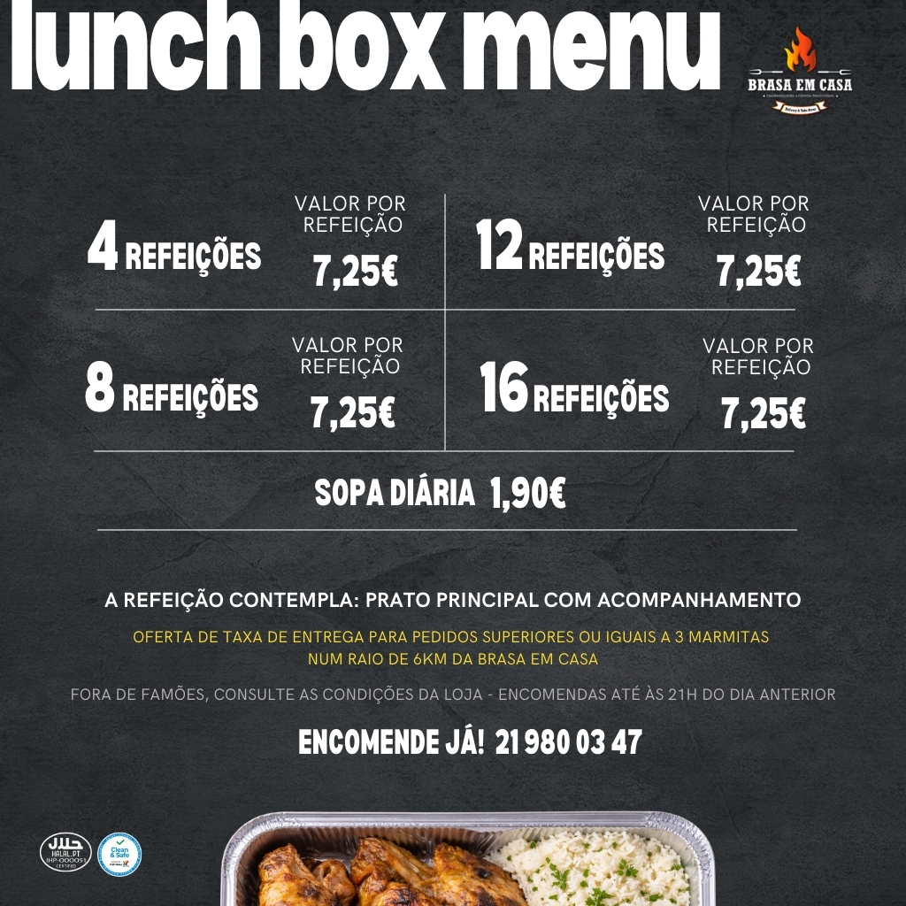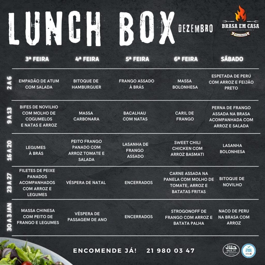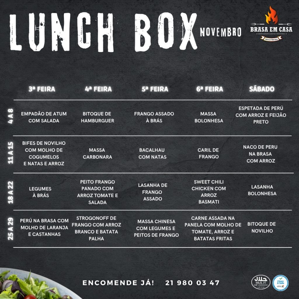 A Lunch Box é o seu almoço diretamente da Brasa para onde estiver, seja em casa, escritório, oficina ou escola.Organizamos as refeições da semana com opções caseiras confeccionadas na hora e a pensar especialmente em si. De terça a sexta-feira, receba o nosso prato do dia.O almoço quem cozinha somos nós!Refeições completas com prato principal e acompanhamento.Encomendas devem ser efetuadas até às 21h do dia anterior.