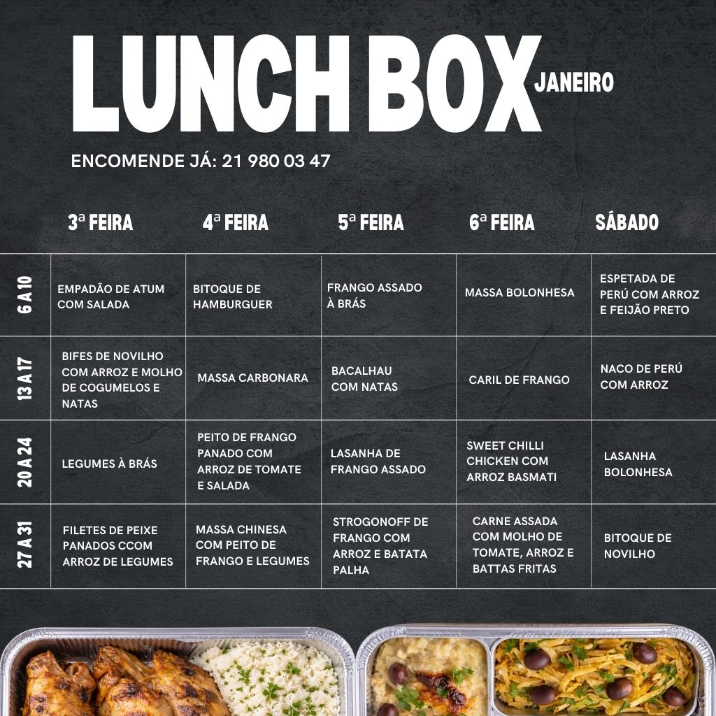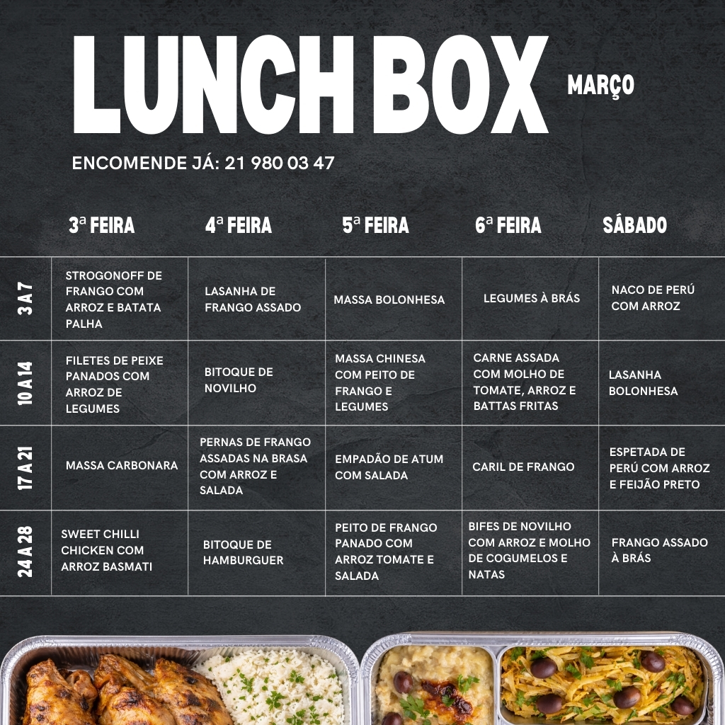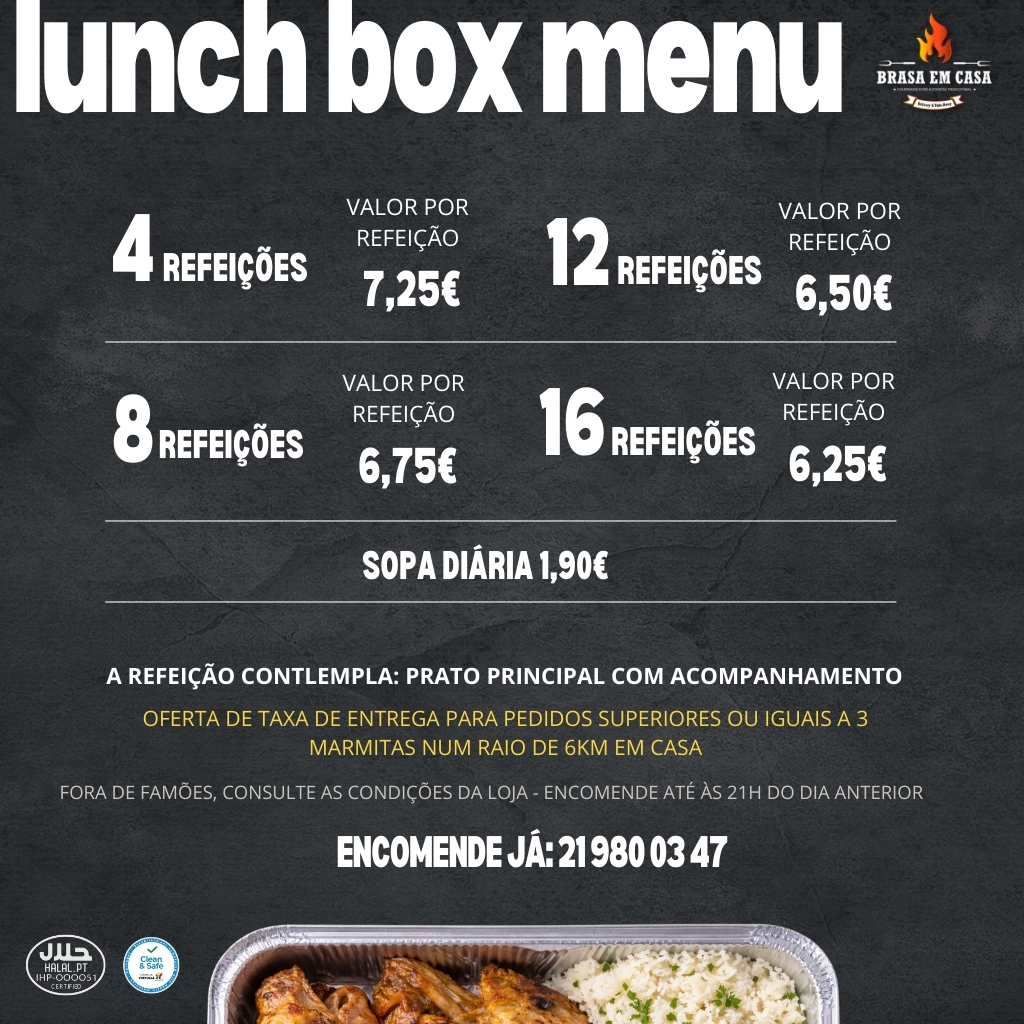 A Lunch Box é o seu almoço diretamente da Brasa para onde estiver, seja em casa, escritório, oficina ou escola.Organizamos as refeições da semana com opções caseiras confeccionadas na hora e a pensar especialmente em si. De terça a sexta-feira, receba o nosso prato do dia.O almoço quem cozinha somos nós!Refeições completas com prato principal e acompanhamento.Encomendas devem ser efetuadas até às 21h do dia anterior.